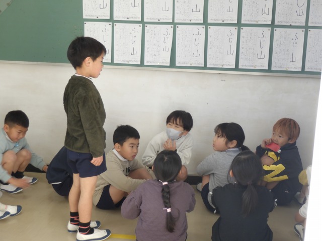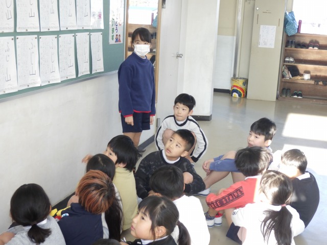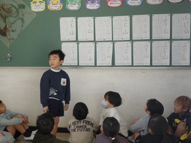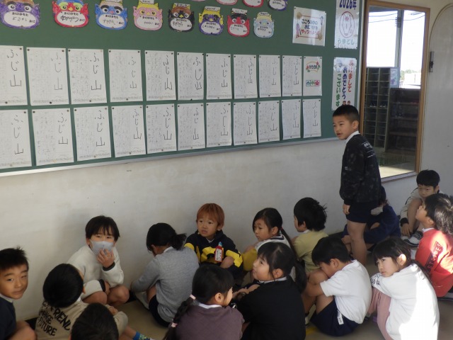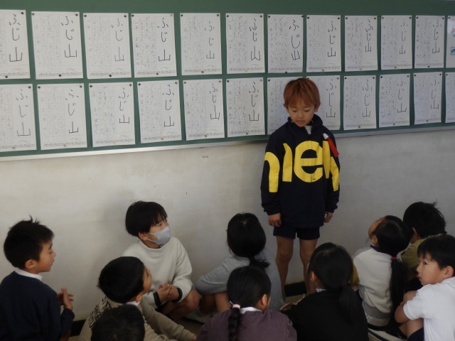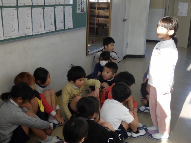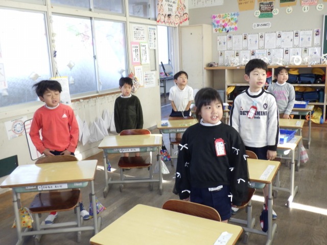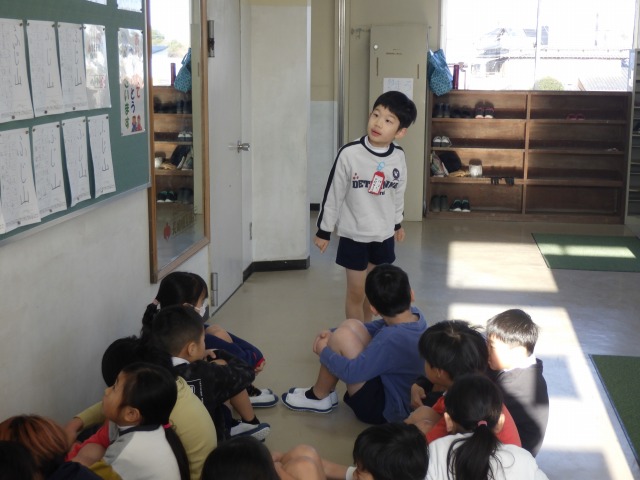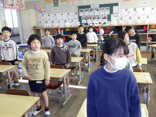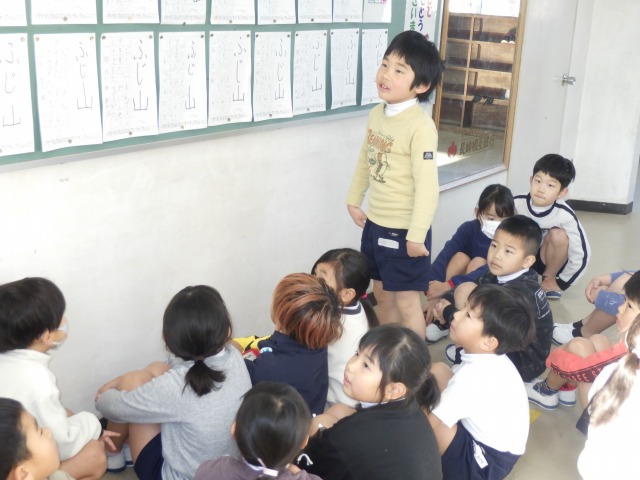 1年生が節分にちなんで「心の鬼たいじ」をテーマに、自分が直したいことを目標に掲示していました。今日は、その振り返りを一人ずつ発表しました。「字がざつおにはやっつけられたよ」、「ろうか走りおにはもう出てこないようにしたい」など、できたことやこれからの目標を話しました。みんなで心の鬼たいじに挑戦する、すてきな時間になりました。