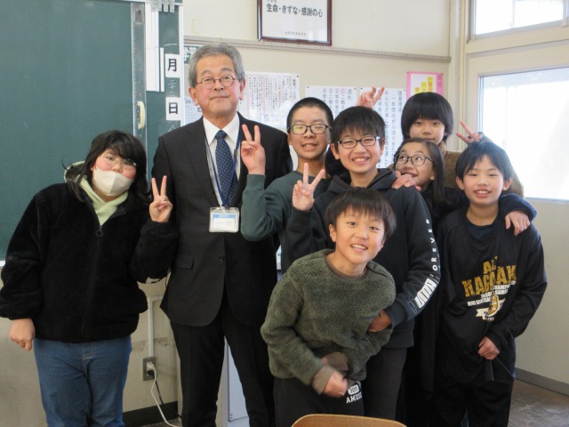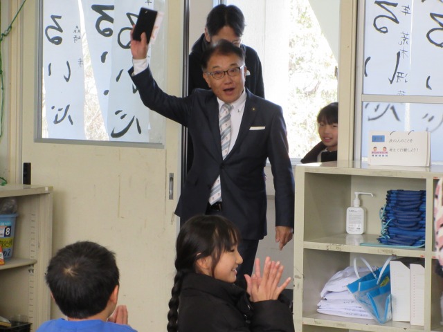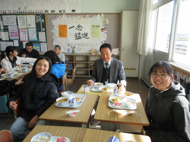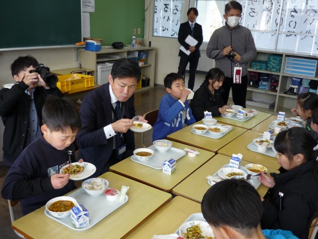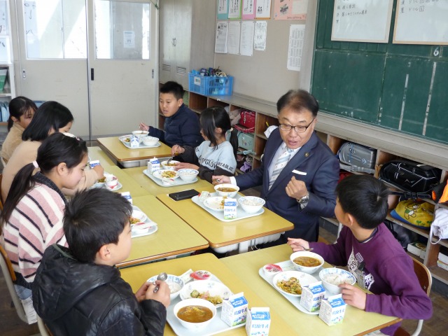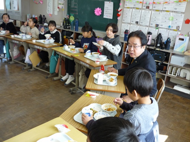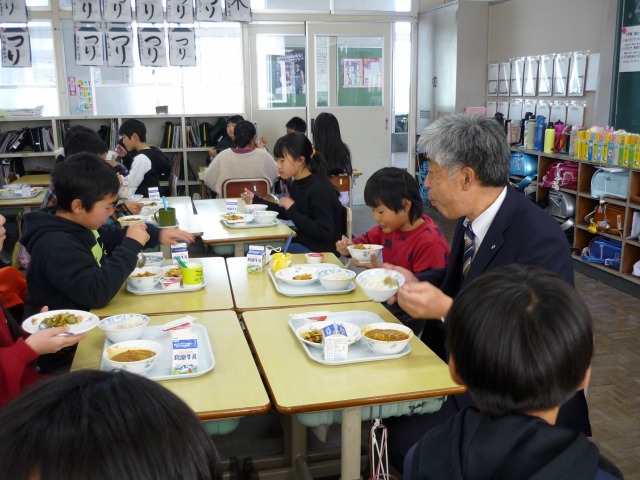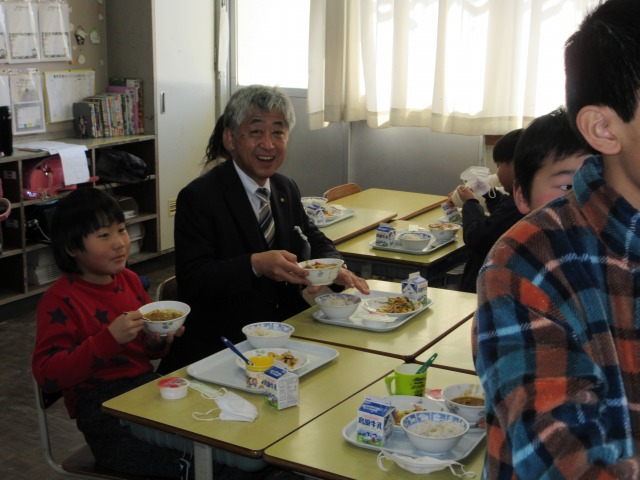 1月23日(金)全国学校給食週間に合わせ、市長様や教育委員会の皆様が本校を訪問され、ふれあい給食が行われました。まず、会議室であいさつや今日のメニューの説明をしました。そのあと、各学級の子どもたちが、お客様方を会議室へお迎えをし、それぞれの学級で子どもたちと一緒に給食を味わわれました。献立は、冬野菜カレー、野菜サラダ、豆乳いちごムース、牛乳。