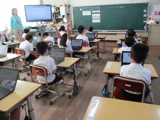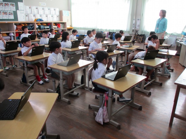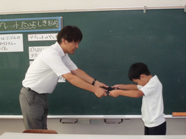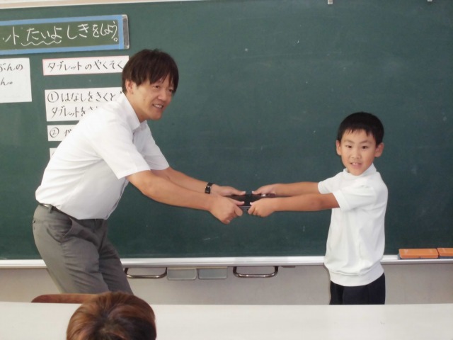 一昨日(10/6)1年生にタブレット貸与式を行いました。ルールを守って使うことを約束し、早速、挑戦してみました。学習ドリルに取り組んだり、アンケートに答えたりしながら、画面を操作する楽しさを体験しました。操作がうまくいくたびに子どもたちの歓声が響き、学ぶ喜びにあふれていました。