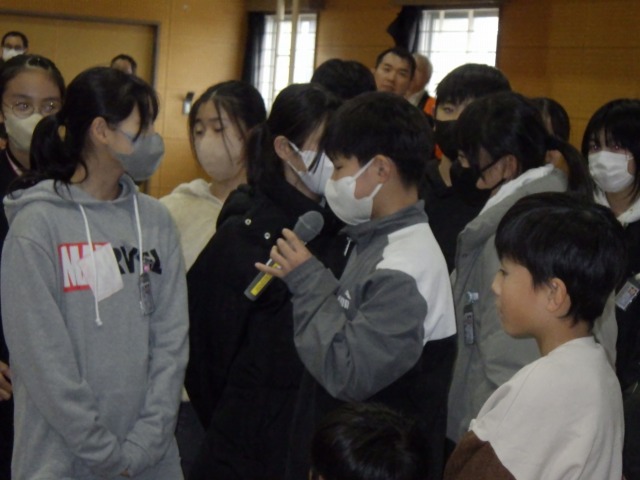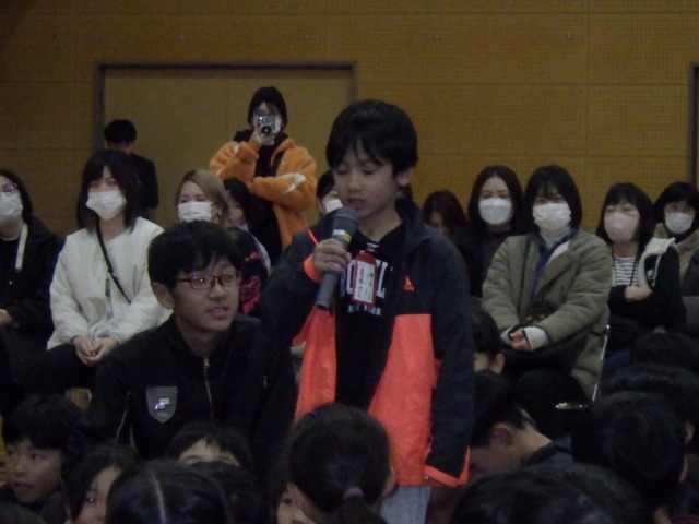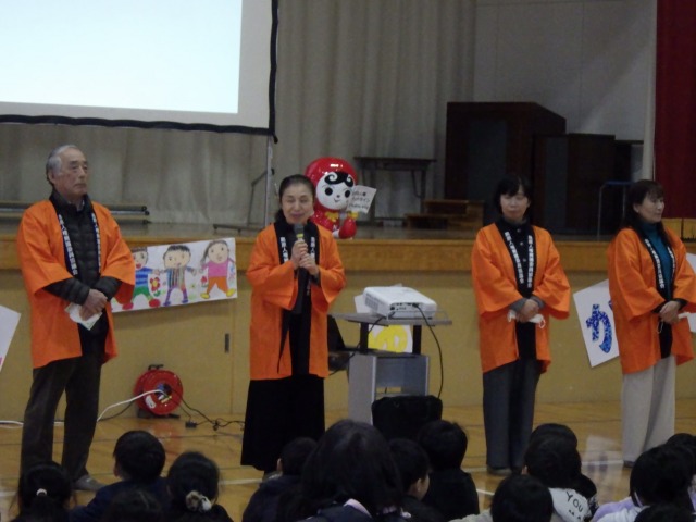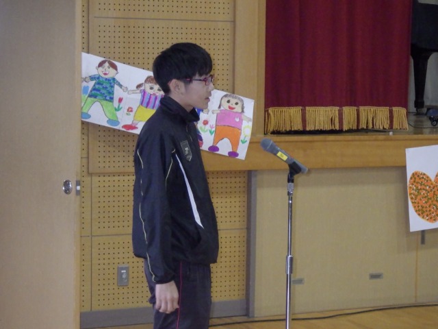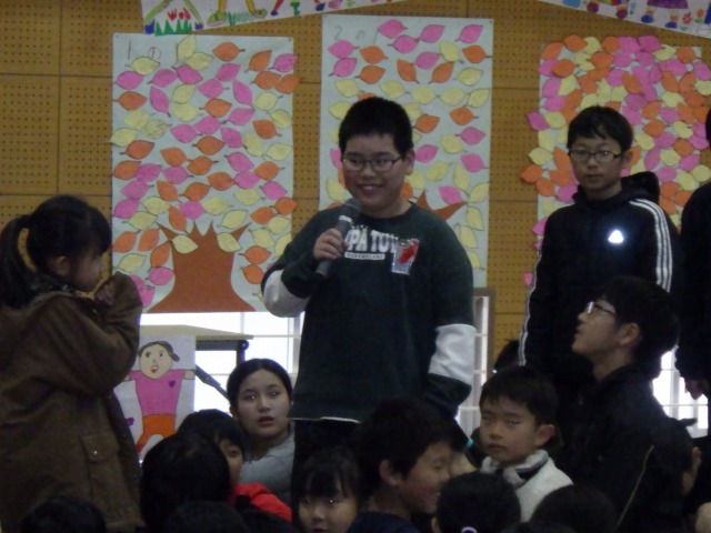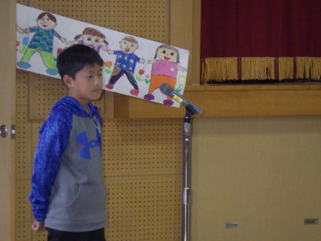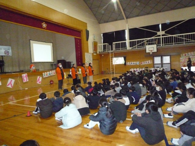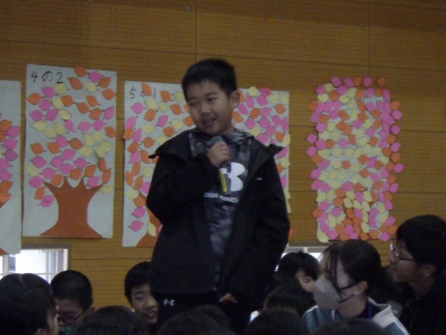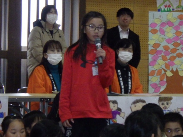 12月4日(木)午後、授業参観を兼ねて人権集会を行いました。本校では、12月4日から10日までを人権週間として、さまざまな活動に取り組みました。特に全校では、やさしさやなかよしにつながる友だちの言動を見つけ「ありがとうの実・葉」に書き、「ありがとうの木」に掲示しました。体育館には、各学級の「ありがとうの木」が飾られました。集会の中では、人権擁護委員のみなさまに読み語りをしていただきました。子どもたちは、しっかりと話を聞きながら人権について考えました。