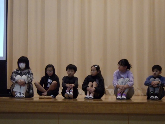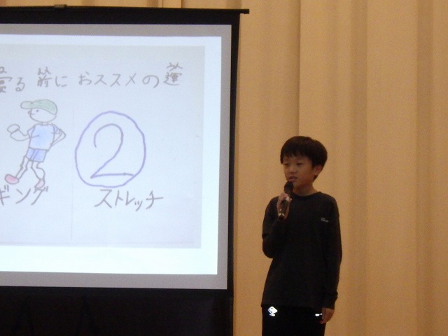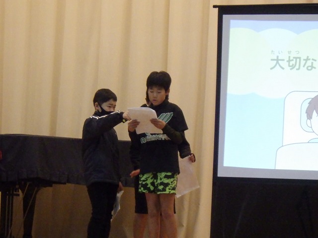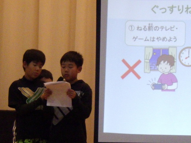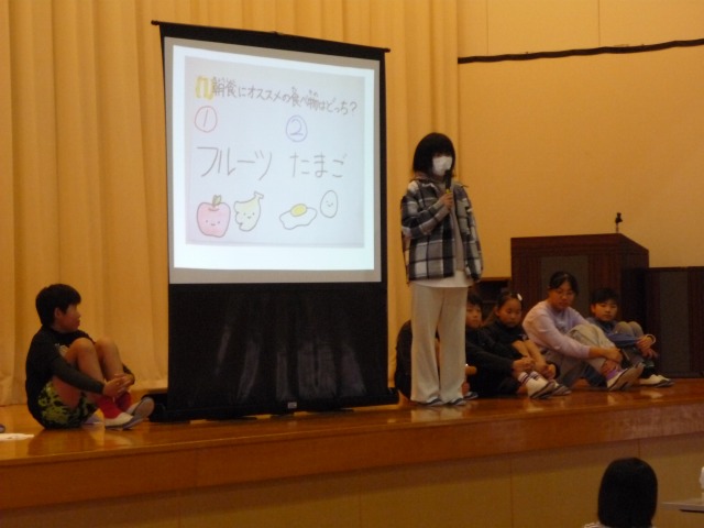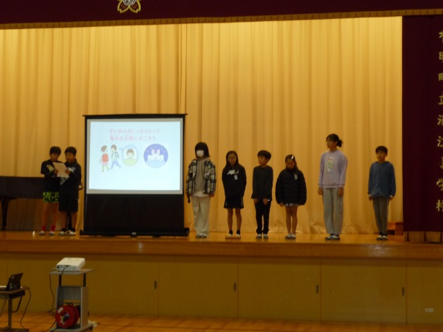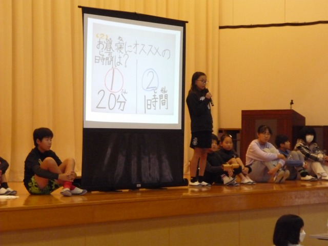 11月5日(水)の児童集会は、保健委員会の発表でした。今回の内容は、「大切なすいみん」についてでした。すいみんのはたらきや必要なすいみん時間などについて、資料やクイズを交えながら、楽しくわかりやすく発表しました。