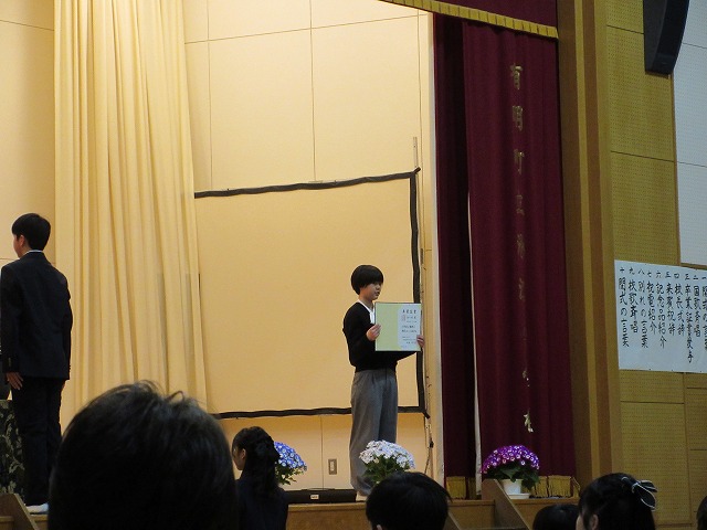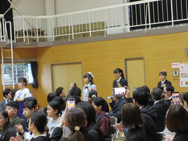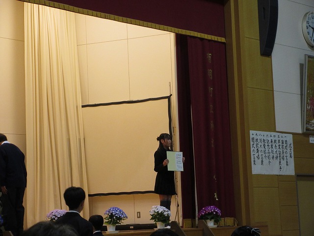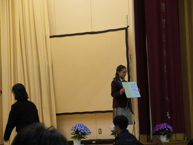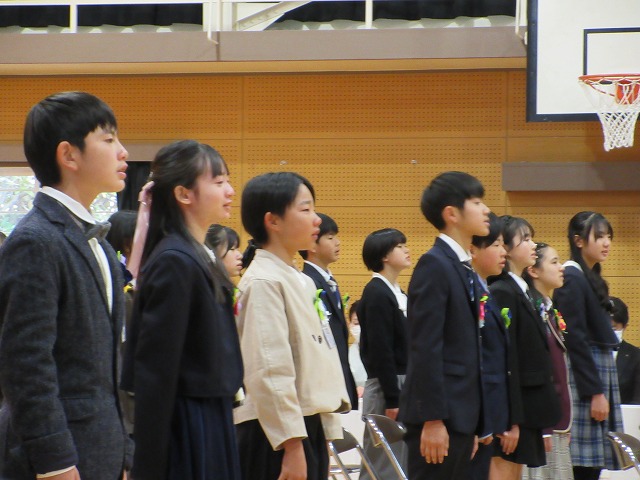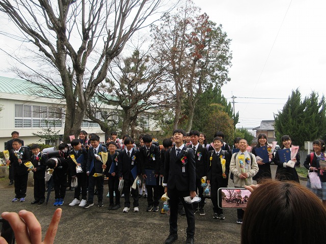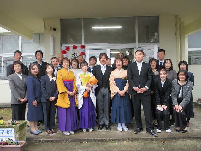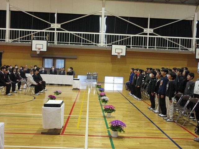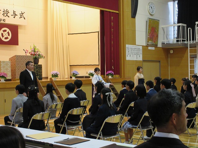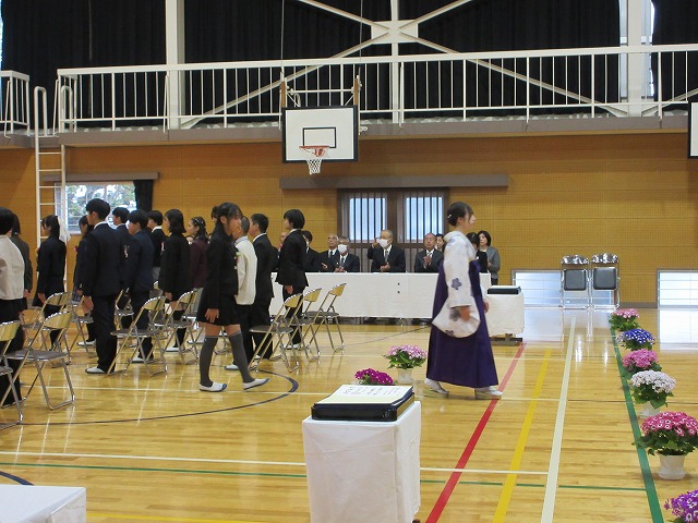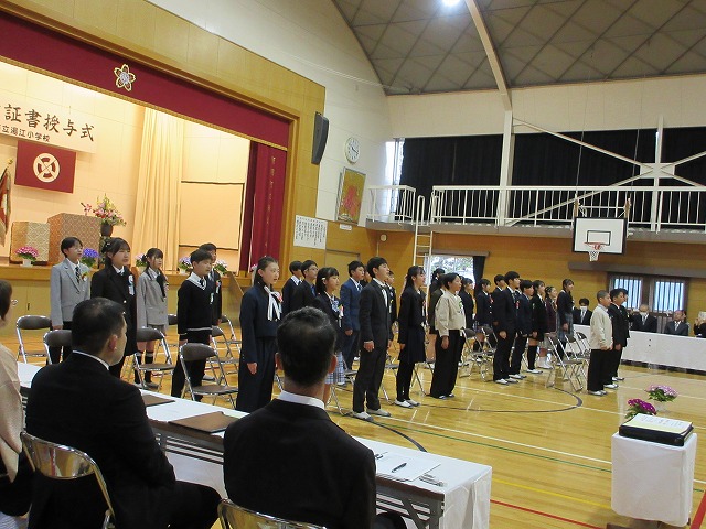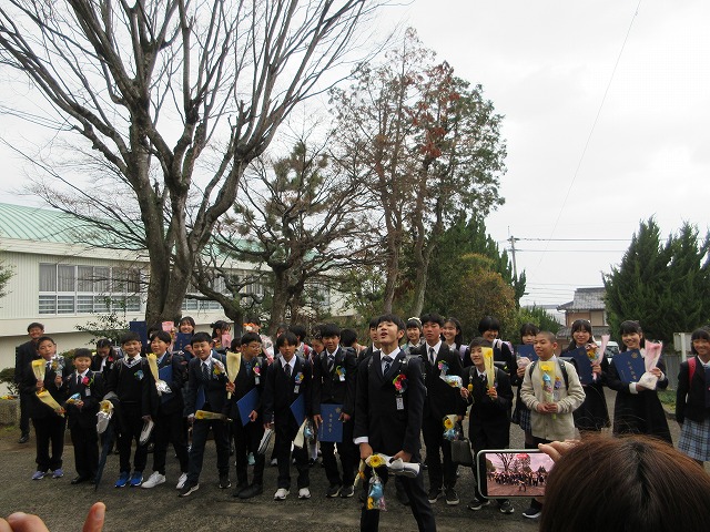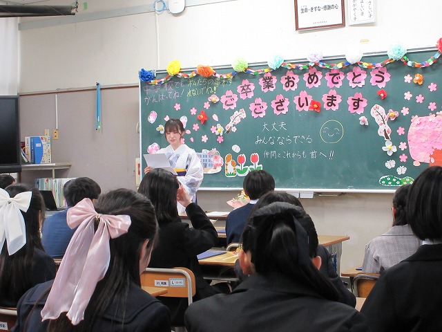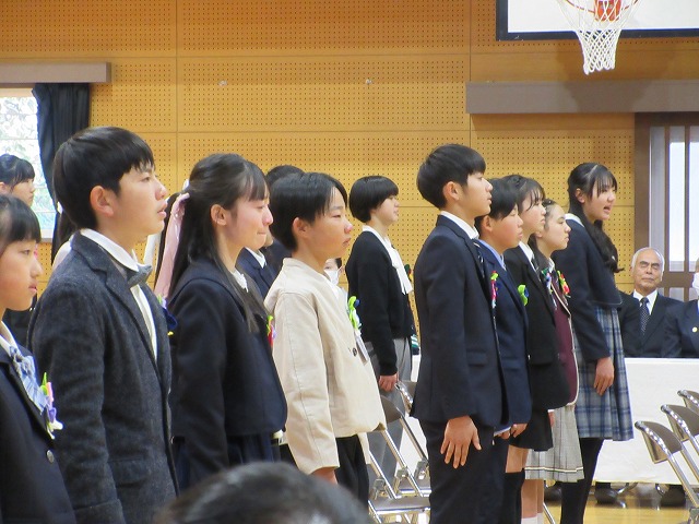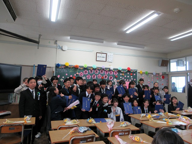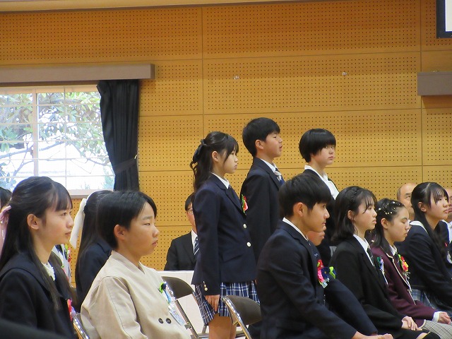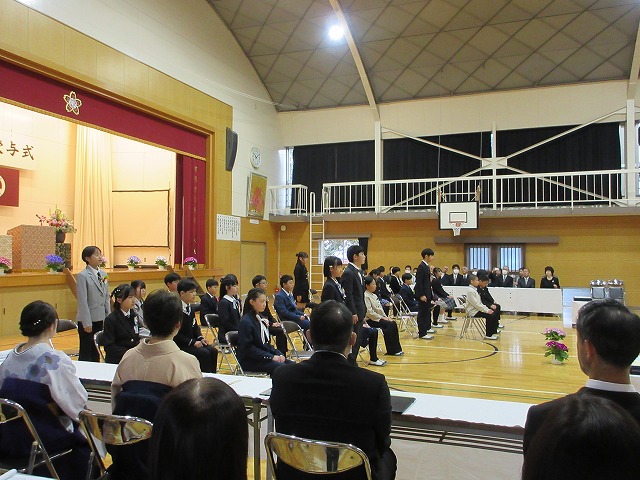 3月18日(水)、第79回卒業証書授与式を行いました。たくさんの保護者、ご来賓の方々を前に、33名は1年間の成長を思わせる立派な態度で証書を受け取りました。別れの言葉や歌では、胸にじ~んとくるものがあり、熱い思いがこみ上げてきました。心に残るすばらしい卒業式でした。希望輝く33名の今後の活躍が楽しみです。