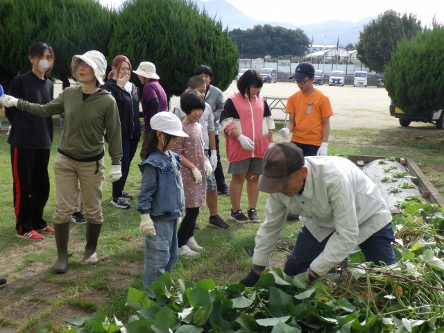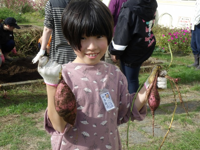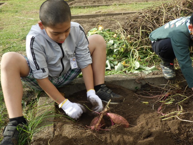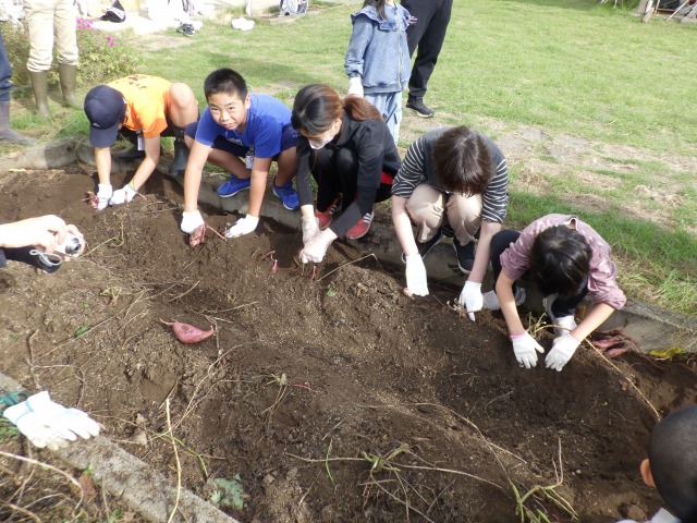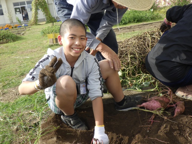 10月30日(木)、ひまわり学級とたんぽぽ学級合同で、学級園で育てたさつまいものいも掘りを行いました。最初に地域の宮本さんの話を聞き、その指導のもといもを掘りはじめました。子どもたちは、思った以上に大きく、たくさんのいもがとれて大喜びでした。収穫したいもは、11月27日(木)に食生活改善委員の方を招いて、親子調理を行う予定です。
