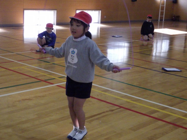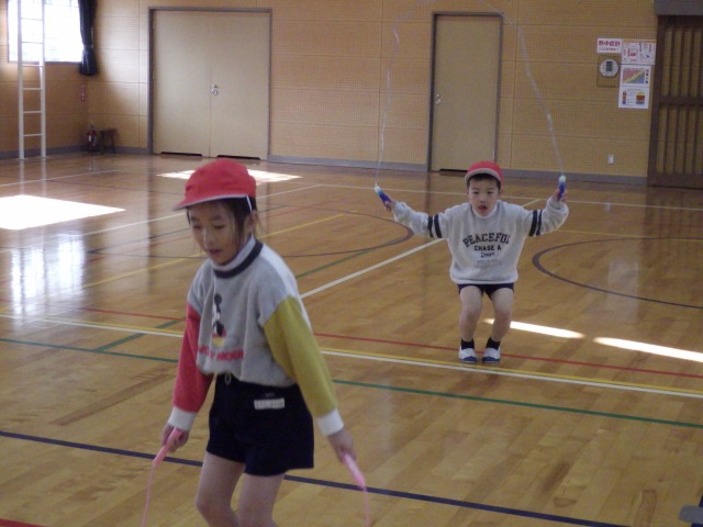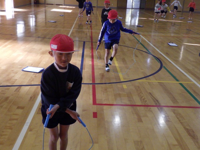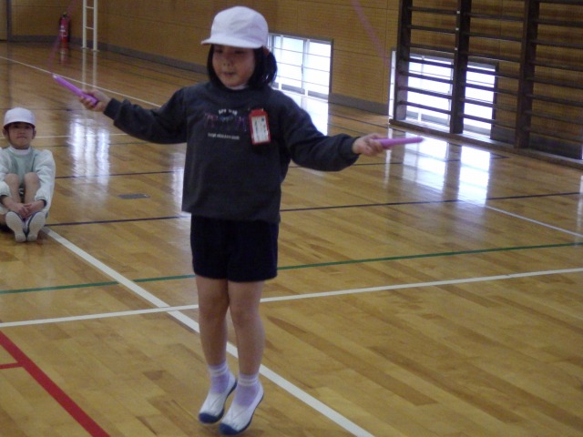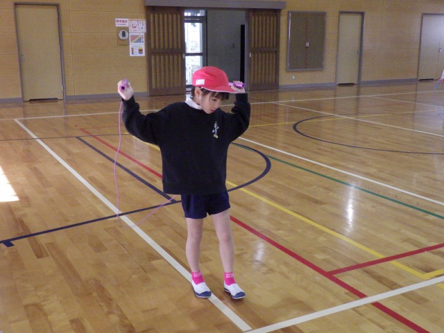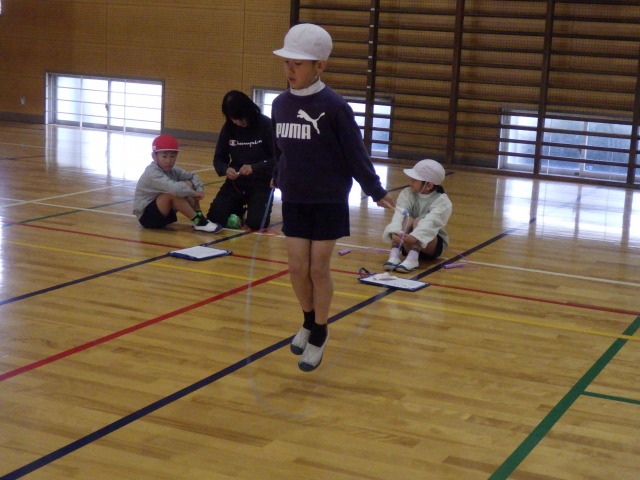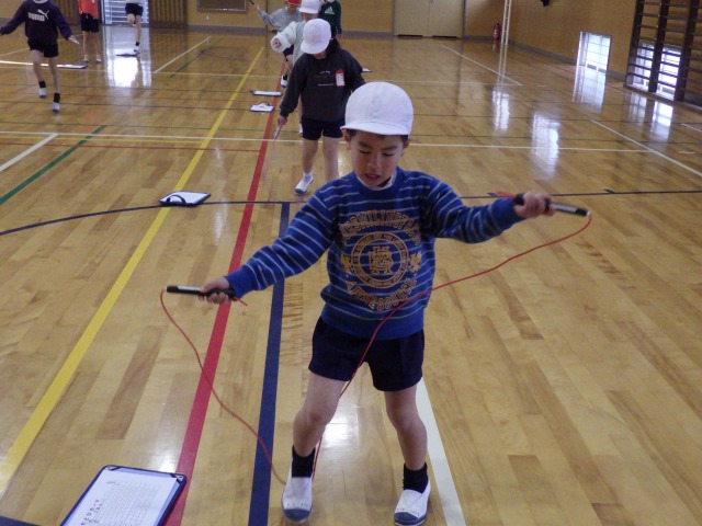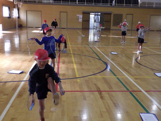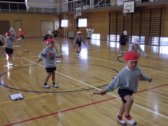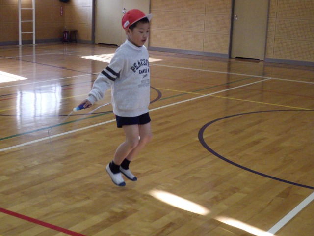 1年生が体育の学習で、なわとびに取り組んでいます。多くの子どもたちは、まだ前とびに挑戦している段階で、なわを回すことや跳ぶタイミングをつかもうと一生懸命です。前とびがなかなかできない子どもたちも、なわを床に置いて跳んだり、先生や友だちと一緒に動きを確かめたりしながら練習しています。一人一人自分のペースで練習に取り組み、できた喜びを感じながら、楽しく体を動かしています。