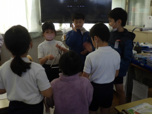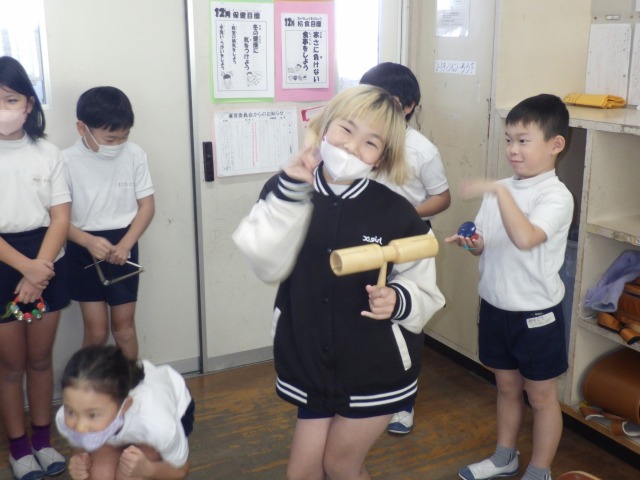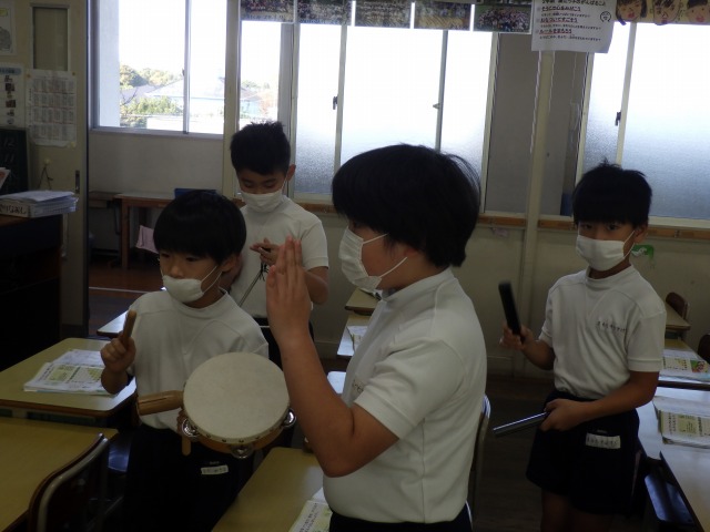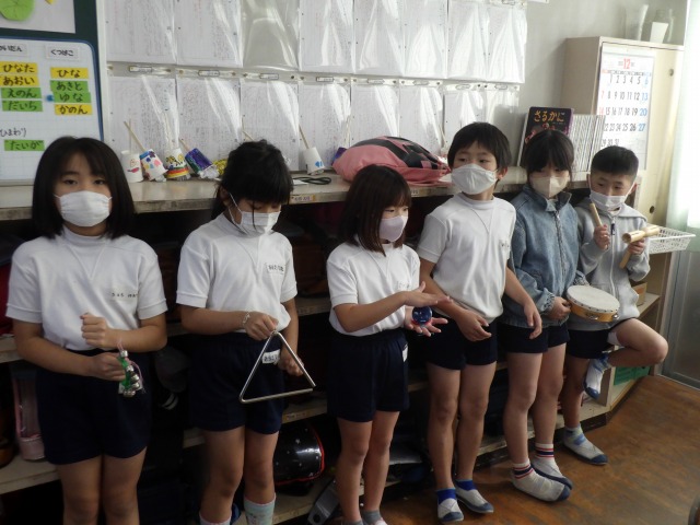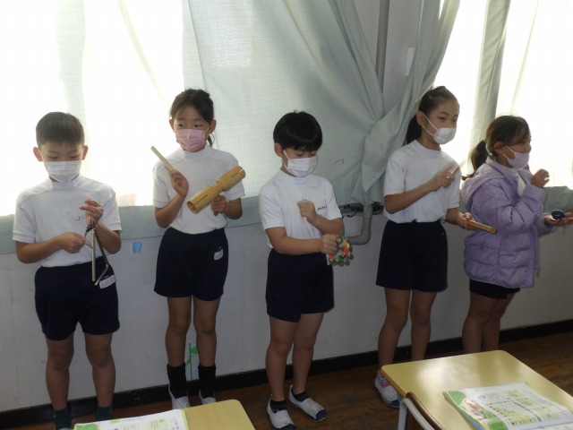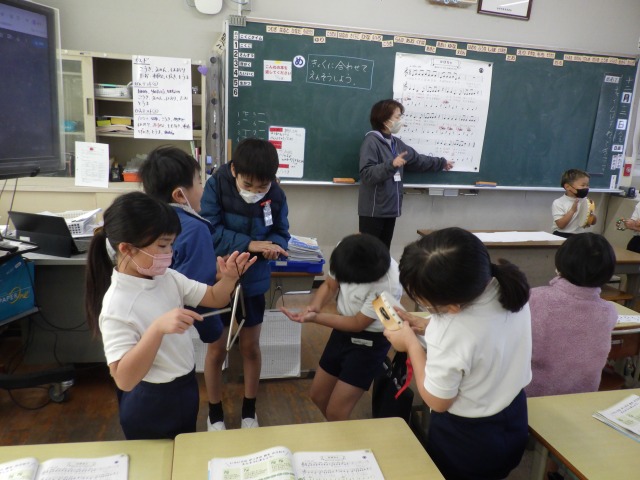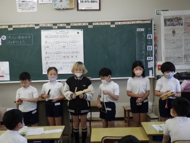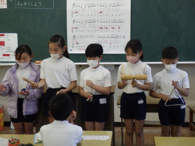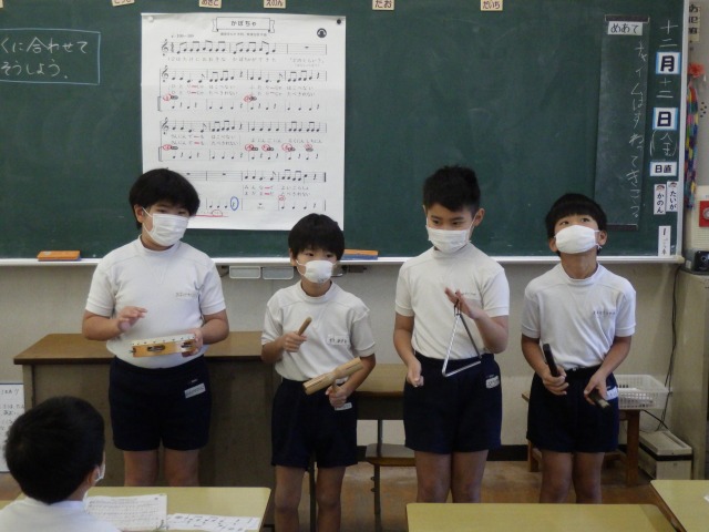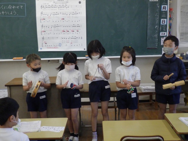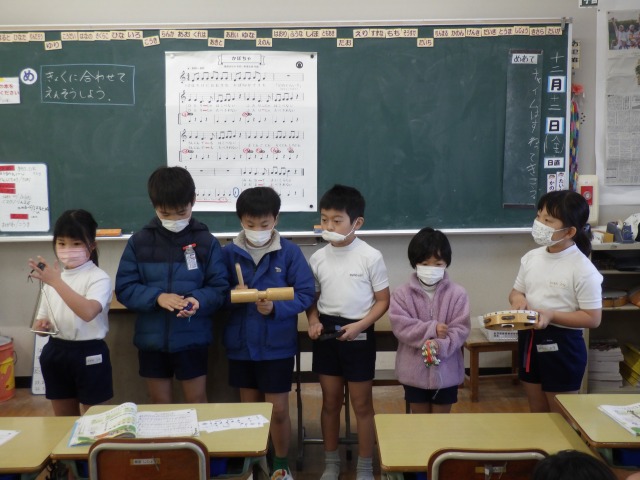 12月12日(金)2年生が音楽で「かぼちゃ」の曲に合わせ、班ごとに工夫した演奏を披露しました。タンバリンやカスタネット、鈴など、それぞれが担当の楽器を持ち、リズムをそろえて楽しそうに音を重ねていました。発表の中では、友達の音をよく聴きながら強弱をつけたり、タイミングを合わせたりする姿も見られ、これまでの練習の成果がよく表れていました。どの班も力を合わせた温かい演奏となりました。