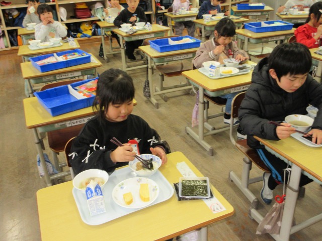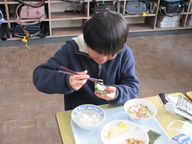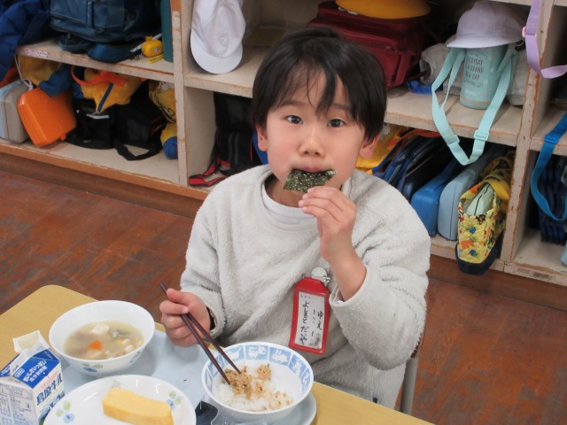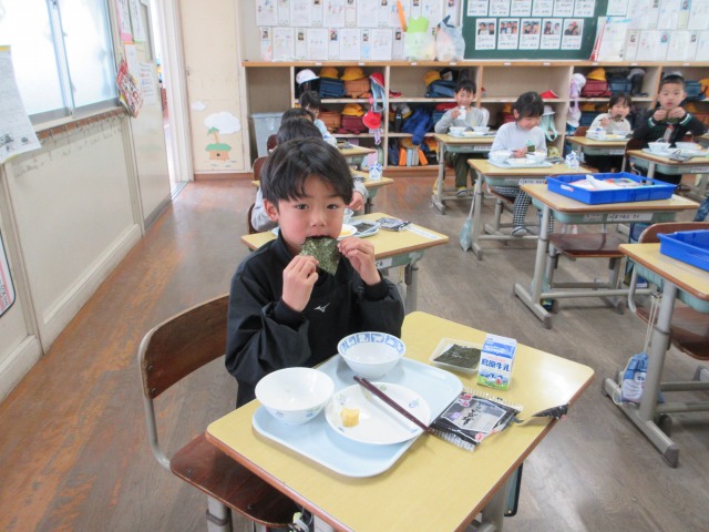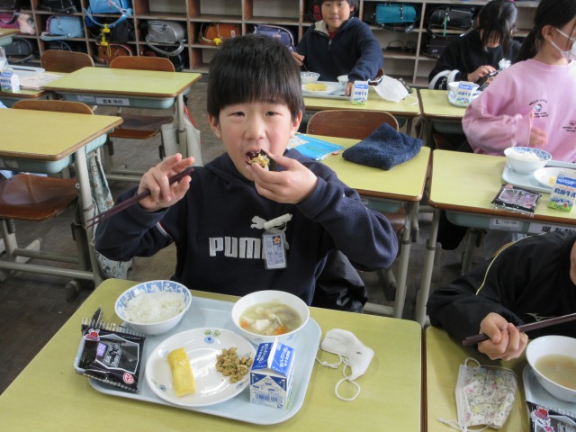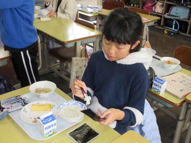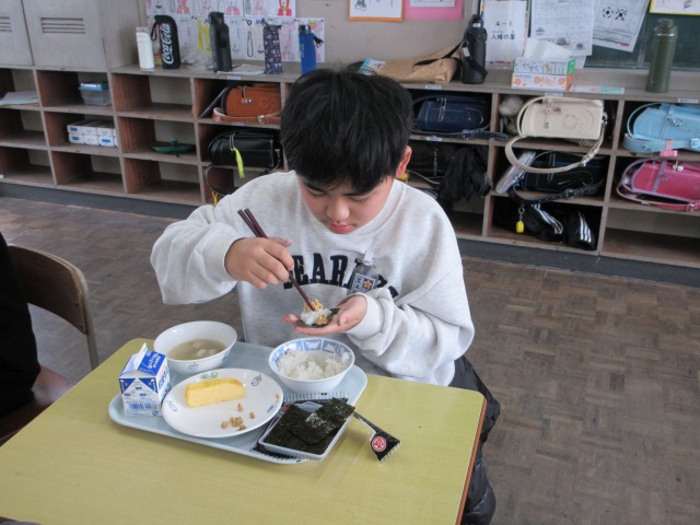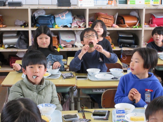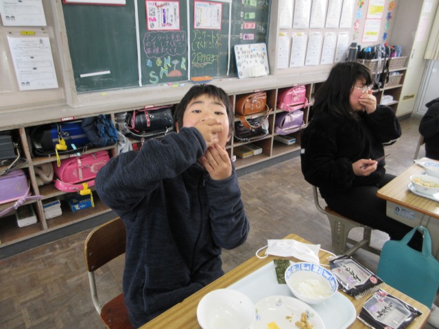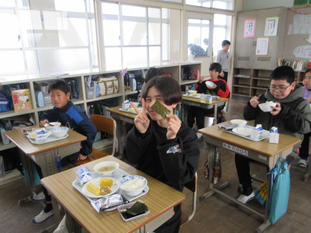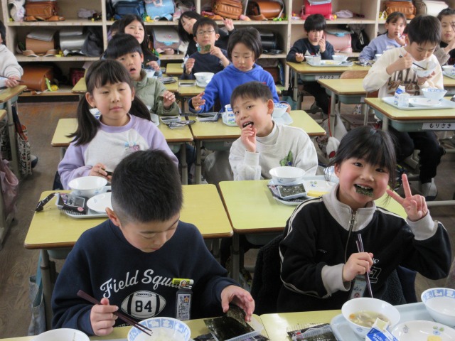 2月6日(金)は、「海苔の日」にちなんで、(株)丸政水産様から提供された海苔を給食でいただきました。海苔は、日本一の生産量を誇る有明海で育ったものです。たんぱく質やビタミン、ミネラルなど栄養が豊富で、体の調子を整える働きがあります。子どもたちは「香りがいい」「ごはんと合うね」と笑顔で味わい、地域の海の恵みに感謝しながら楽しい給食の時間を過ごしました。