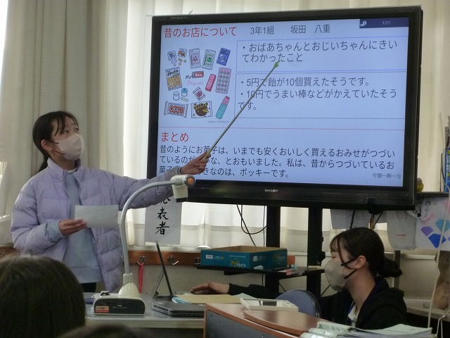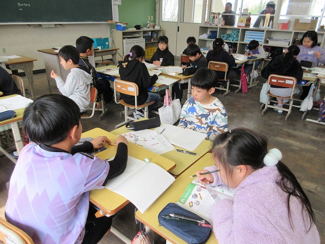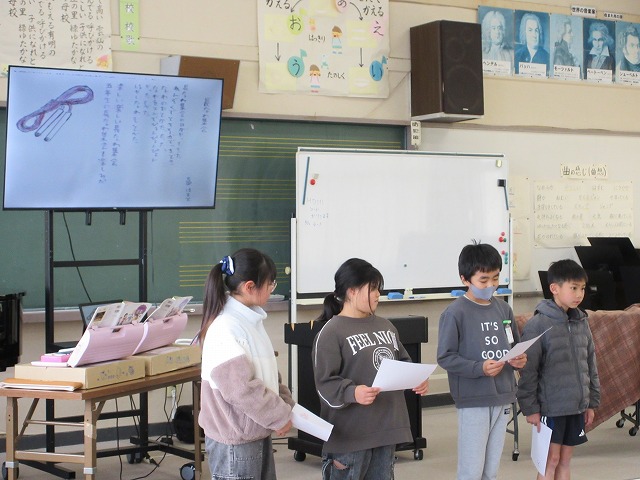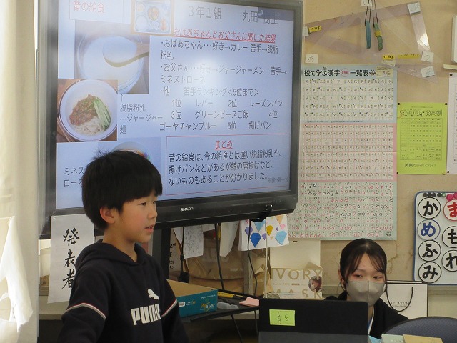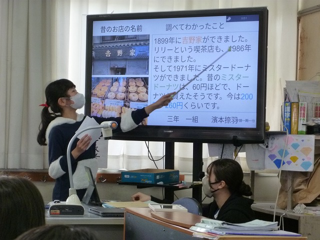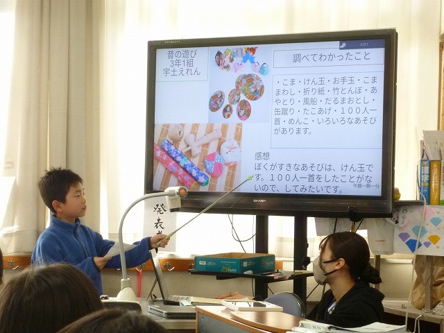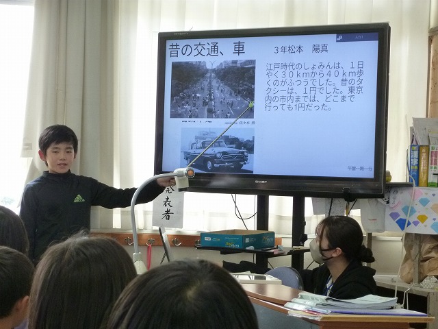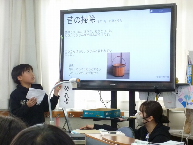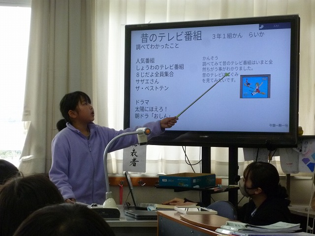 2月19日(木)、3・4年生が、今年度最後の授業参観・学級部会を行いました。3年生は、総合的な学習「昔のくらし物語」でグループごとにテーマを決めて調べたことを発表しました。4年生は、1組が「ミニミニ学習発表会」、2組が算数「箱の形の特ちょうを調べよう」の学習を行いました。たくさんのご参観ありがとうございました!