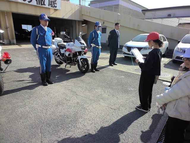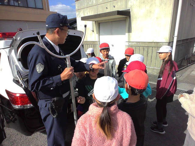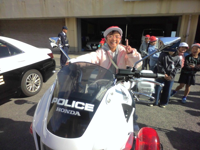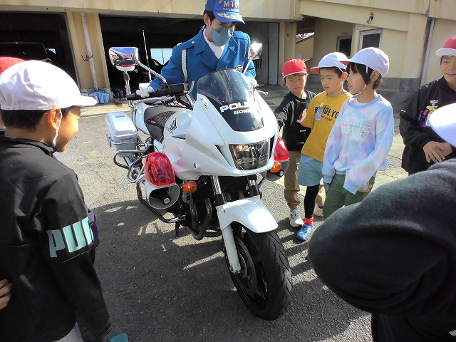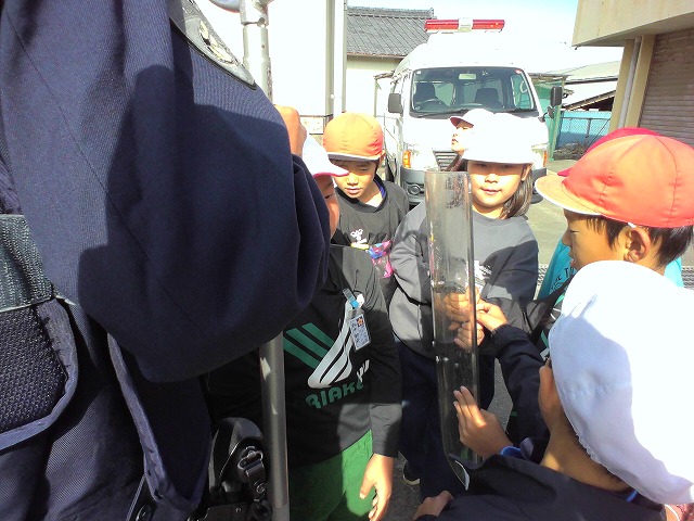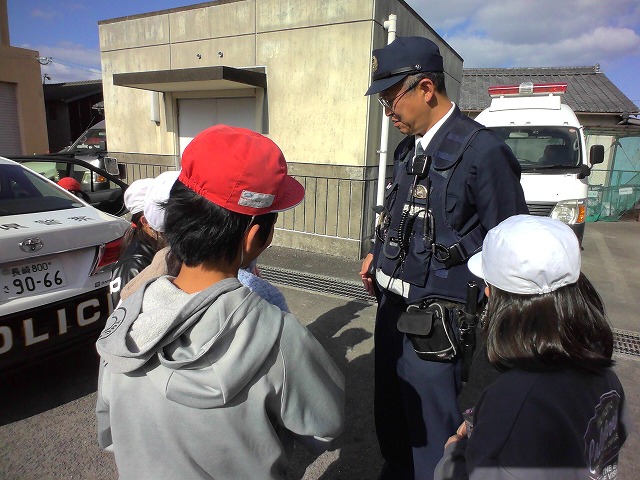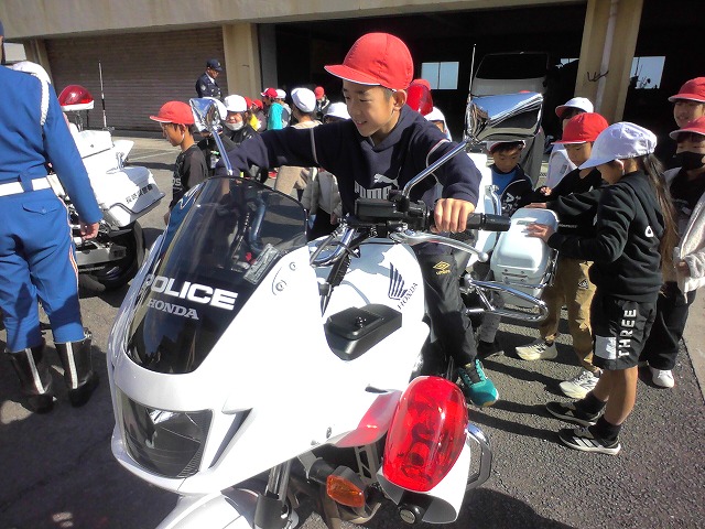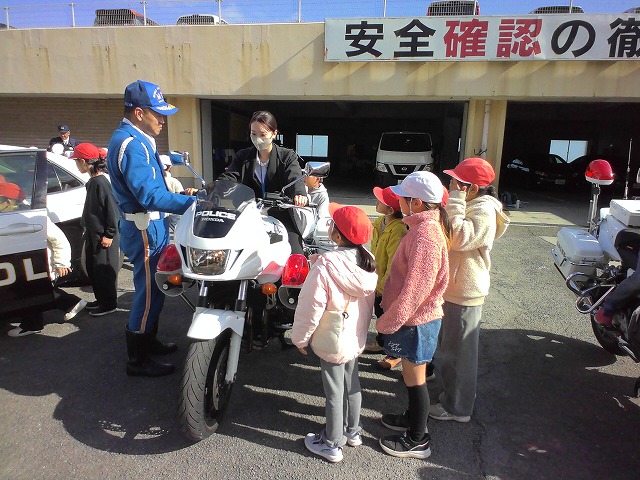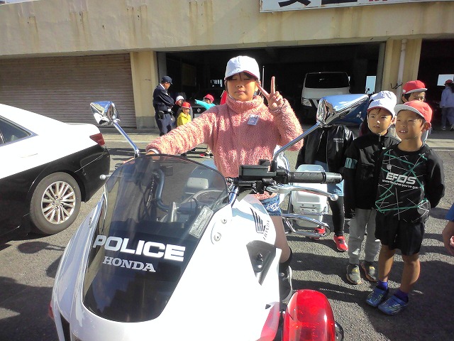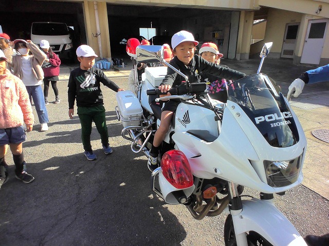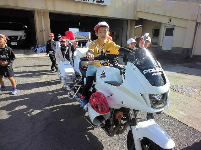 警察署では、事故や事件から人々を守るためにどのような活動をしているのかを学びました。身につけている道具やパトカー、白バイなどの設備を見せてもらい、実際に乗せてもらいました。子どもたちは、その迫力に興奮し、とても喜んでいました。消防署・警察署の方々、たくさんのご協力ありがとうございました。