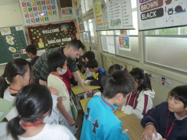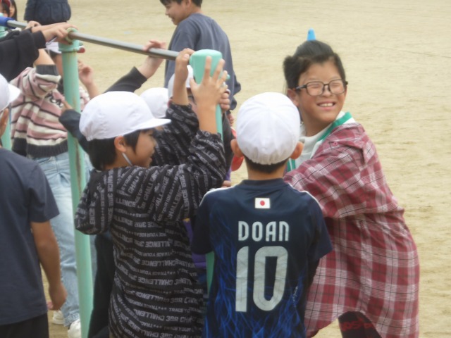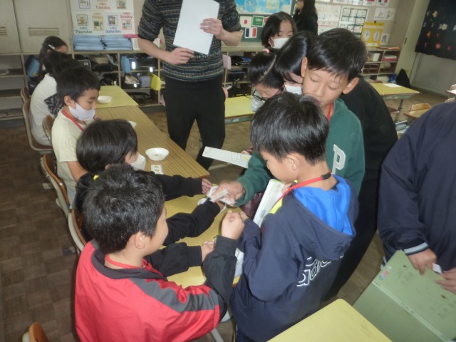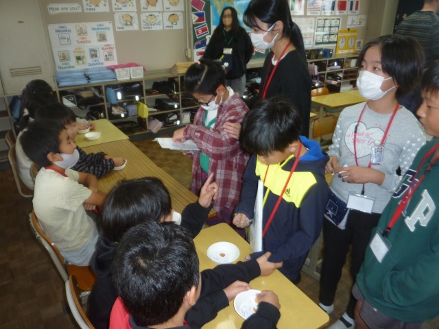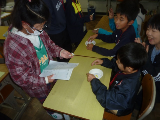 11月13日(木)、4年1組が特別支援学校のお友だちと交流学習をしました。4校時は外国語活動の学習で、英語の表現を使い、果物カードのやりとりをしました。お店役とお客役を交替で行い、楽しく活動しました。給食も一緒に食べ、昼休みは運動場で「色おに」をして遊びました。久しぶりに会って、子どもたちはお互いに嬉しそうに関わっていました。