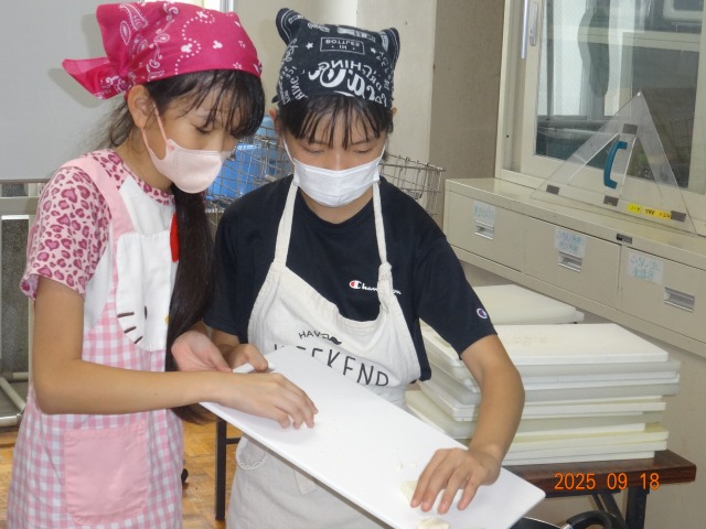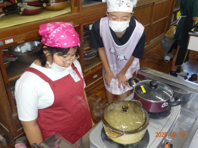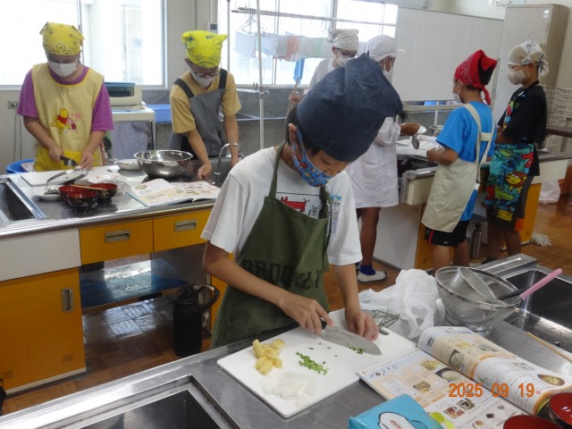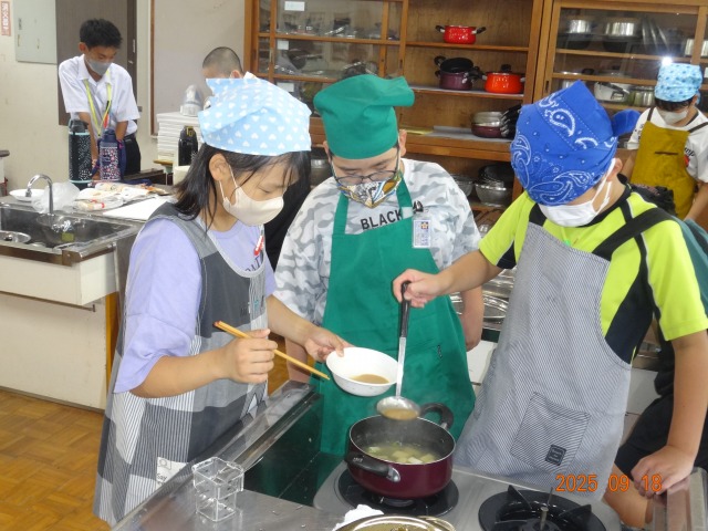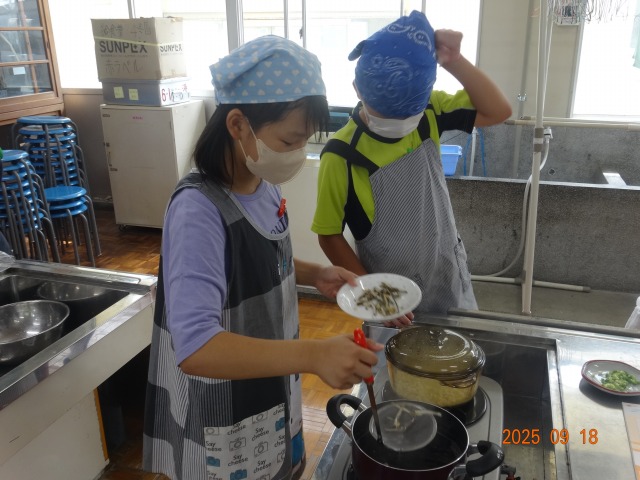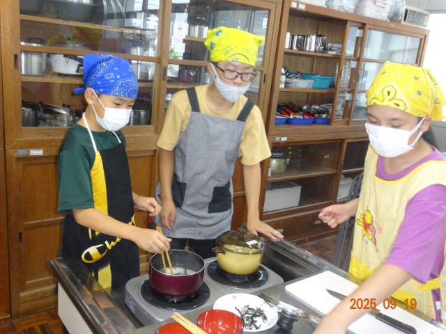 5年生が家庭科の学習でごはんとみそ汁作りに挑戦しました。煮干しからだしを取るところから始め、包丁を使って具材を切り、火加減に気をつけながら調理をしました。初めての作業に緊張しながらも、協力して一生懸命取り組む姿が見られました。完成したみそ汁を試食すると、「おいしい!」「自分で作れてうれしい!」と笑顔いっぱい。家庭科を通して、食への感謝や調理の楽しさを実感することができました。