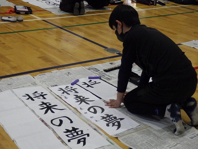 【MANABI】6年生書き初め会! 2026 1/16 湯江っ子のMANABI 2026年1月16日 目次将来の夢 1月15日(木)に、6年生が書き初め会を行いました。課題は「将来の夢」。なりたい自分を思い描きながら、一文字一文字に願いや決意を込めて丁寧に表現しました。静かな体育館で真剣に筆を運ぶ姿から、未来への思いが強く感じられました。 湯江っ子のMANABI