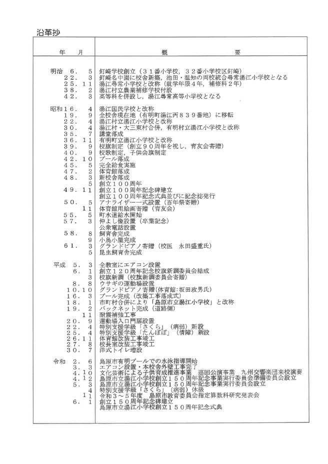 令和5年度に創立150周年を迎え、地域、卒業生、在校生、保護者など、たくさんの方々と一緒に記念式典が行われました。校庭には、湯江小の子どもたちを見つめ、見守ってきたシンボルツリーであるクスノキがあり、その大きさからも脈々と受け継がれてきた伝統と教育愛を感じることができます。